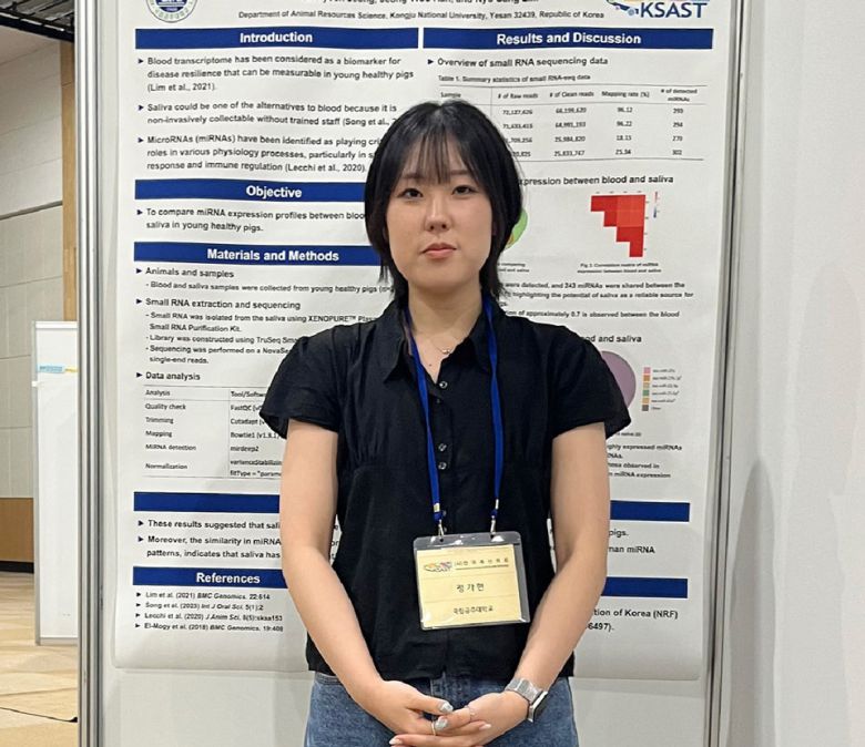 한편 정가현 학생은 현재 국립공주대학교 대학원 동물자원학과 가축유전학 연구실(지도교수 임규상) 소속으로, 돼지 타액에서 유래한 microRNA 발현 특성을 연구함으로써, 비침습적 바이오마커로서의 타액의 가능성을 탐색하는 연구를 수행하고 있다.
