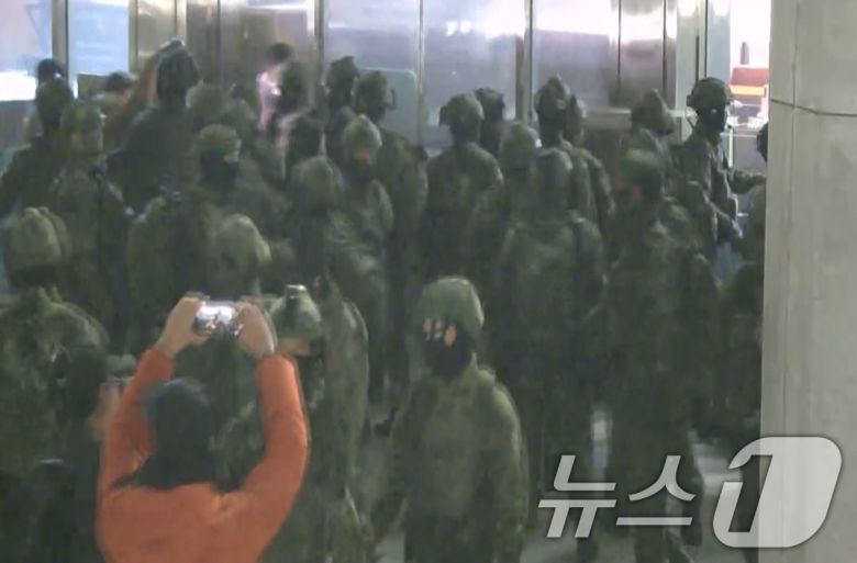 국회사무처가 계엄군의 국회 본관 진입 과정이 담긴 CCTV를 4일 공개했다. 김민기 국회사무총장은 국방부가 헬기로 24차례에 걸쳐 무장한 계엄군 230여 명을 국회 경내로 진입시켰다며 0시 40분에는 계엄군 50여 명을 추가로 국회 외곽 담장을 넘어 진입시켰다고 전했다. 사진은 국회 본관 진입을 시도하는 계엄군 모습. (국회사무처 제공) 2024.12.4/뉴스1 |