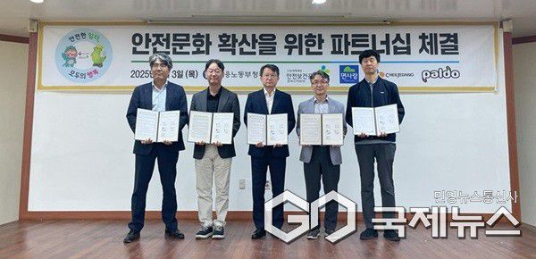 (청주=국제뉴스) 이재기 기자 = 안전보건공단 충북지역본부(본부장 이규득)와 고용노동부 청주지청(지청장 연창석), (주)면사랑 진천공장(공장장 임찬원), CJ제일제당 진천 Blossom Campus(공장장 김중현), (주)팔도 진천공장(공장장 박주일)은 고용노동부 청주지청에서 안전문화 확산을 위한 파트너십을 체결했다.
