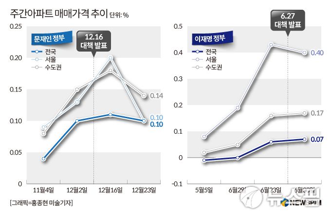 하지만 효과는 크지 않았다. 한국부동산원에 따르면 12·16 대책 직후 서울 주간아파트 매매가격은 0.20% 상승했다. 다만 일주일만에 0.10%로 상승폭이 축소됐다. 반면 수도권은 같은기간 0.18%에서 0.14%로 0.04%포인트(p) 떨어진데 그쳤다.