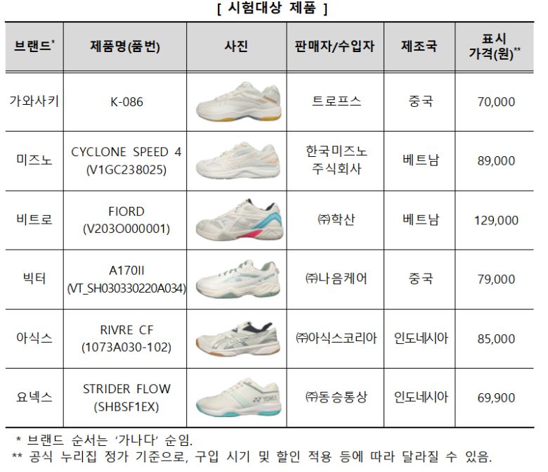3일 한국소비자원은 시중에서 판매되는 6개 인기 브랜드의 배드민턴화 제품을 시험 평가한 결과를 공개했다. 대상 제품은 가와사키(K-086), 미즈노(CYCLONE SPEED 4), 비트로(FIORD), 빅터(A170II), 아식스(RIVRE CF), 요넥스(STRIDER FLOW) 등이다.