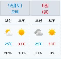 6일 일요일도 비슷한 날씨가 이어진다. 오전에는 흐리겠지만 오후에는 다시 맑아질 것으로 보인다. 기온은 전날과 비슷하게 오전 25도, 오후 33도를 기록할 것으로 보이며, 강수 확률은 오전 30%, 오후 0%다.