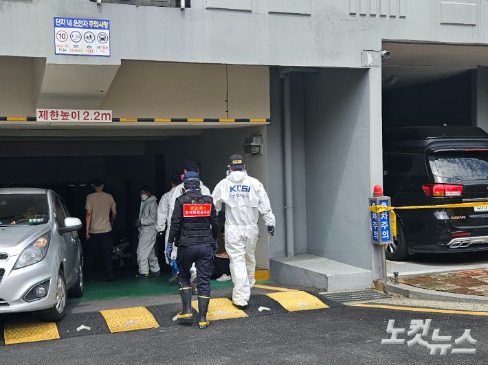 3일 화재가 난 부산 기장군의 한 아파트에서 부산경찰청 화재조사팀과 국과수, 부산소방재난본부, 전기안전공사 등이 합동감식을 진행하고 있다. 김혜민 기자 |