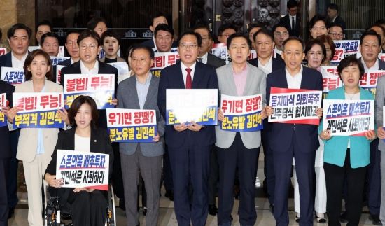 송언석 비상대책위원장 겸 원내대표를 비롯한 국민의힘 의원들이 3일 본회의가 열린 국회 본회의장 앞에서 김민석 국무총리 후보자 임명동의안 표결에 불참한 뒤 규탄 피케팅을 하고 있다. <ⓒ투자가를 위한 경제콘텐츠 플랫폼, 아시아경제(www.asiae.co.kr) 무단전재 배포금지>이 기사의 카테고리는 언론사의 분류를 따릅니다.0공유하기
