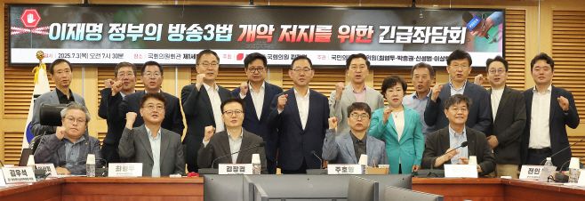 3일 서울 여의도 국회 의원회관에서 국민의힘 김장겸 의원실 주최로열린 이재명 정부의 방송3법 개악 저지를 위한 긴급좌담회에서 참석자들이 기념 촬영을 하고 있다. /연합