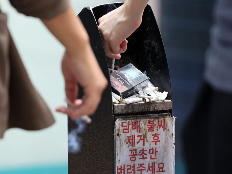 서울 종로구 흡연구역에서 시민들이 담배꽁초를 재떨이에 버리는 모습. /뉴스1 |