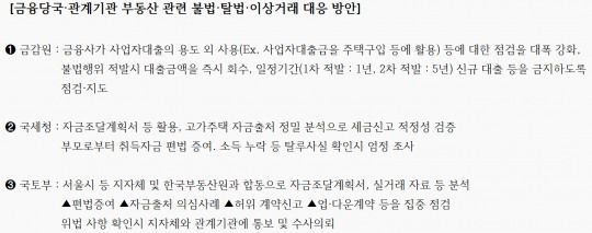 특히, 금융위·국토부·국세청·서울시·금감원 등 관계기관은 향후 공조 강화를 통해 부동산 관련 불법·탈법·이상거래 등에 대한 대응에 만전을 기하기로 했다.
