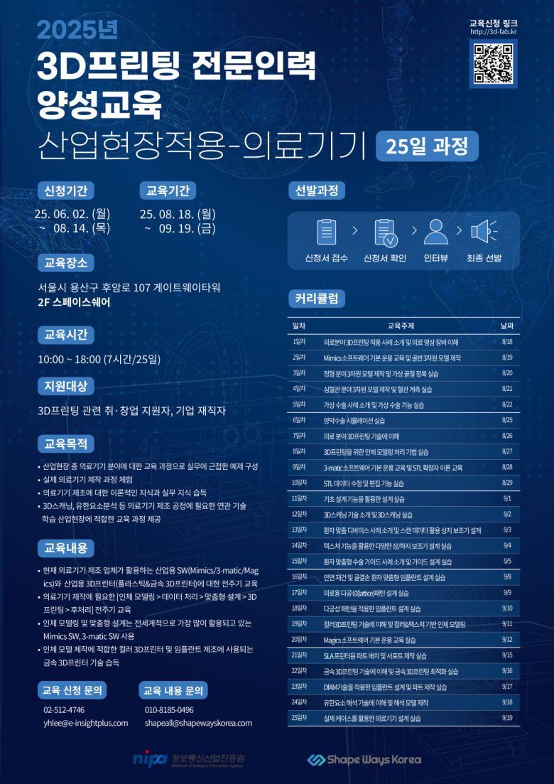 과학기술정보통신부와 정보통신산업진흥원(NIPA)은 '2025년 3D프린팅 전문인력 양성교육'을 실시한다고 3일 밝혔다.