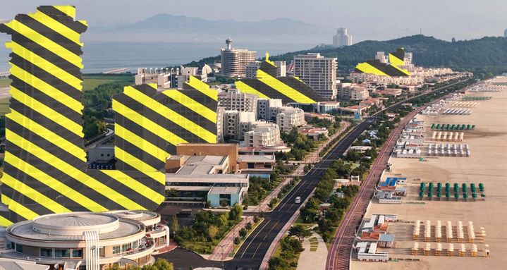 조선중앙통신이 공개한 리조트가 늘어선 해변 사진에서 노란색과 검은색 경고 줄무늬로 표시된 부분은 공식 지도에 이름이 표기되지 않은 곳으로 아직 손님을 맞을 준비가 되지 않았음을 시사한다.