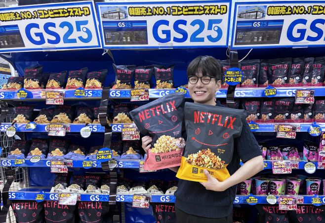 고객이 일본 돈키호테에 입점한 GS25의 넷플릭스 점보 팝콘을 들고 환하게 웃고 있다./GS25
