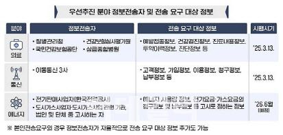 개인정보보호법 개정안에 따라 정보전송자 및 전송 요구 대상이 되는 민감 분야 대상 정보 (자료=개인정보보호위원회)