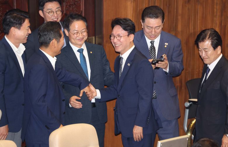 김민석 국무총리가 3일 국회에서 열린 본회의에 참석해 더불어민주당 의원들과 인사를 나누고 있다. 이날 본회의에 상정된 김 총리의 임명동의안은 국민의힘 의원 전원이 불참한 가운데 179명 중 찬성 173표, 반대 3표, 무효 3표로 가결됐다. 한주형 기자 |