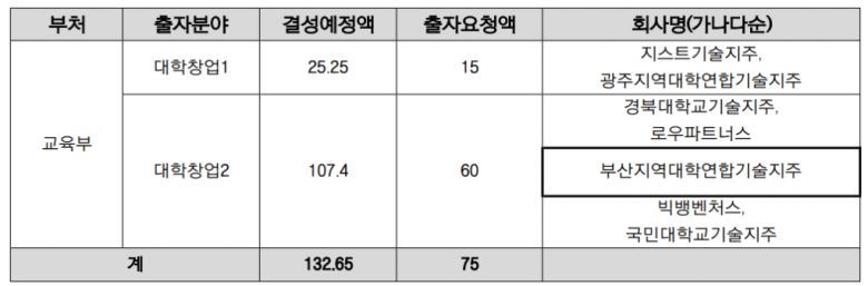 이번 출자사업에는 총 8개 신청팀이 대학창업2 계정에 지원했으며, 이 중 부산연합기술지주를 포함한 5개 기관이 최종 선정됐다. 선정된 기관은 경북대학교기술지주, 로우파트너스, 부산지역대학연합기술지주, 빅뱅벤처스, 국민대학교기술지주다.