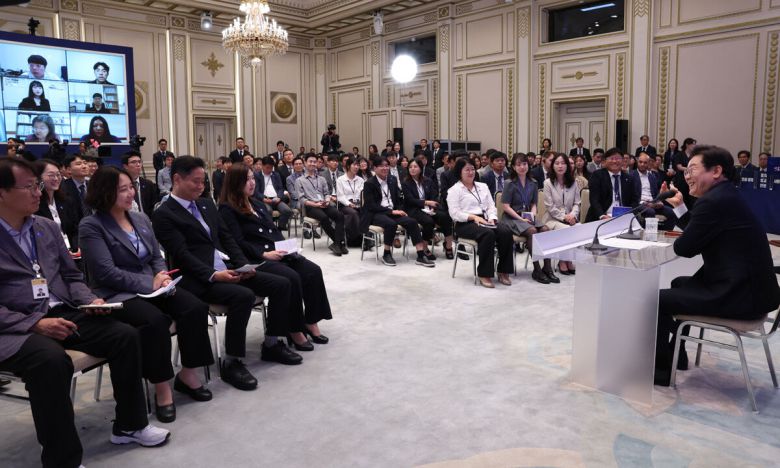이 대통령은 최근 검찰 인사에 대한 비판에 대해서도 입장을 내놨다. 이 대통령은 “검찰개혁은 국회가 입법적 결단을 할 사안이고, 정부에서 할 일은 그로 인한 갈등과 부작용을 최소화하는 게 필요하다”며 “(검찰개혁을) 원만하고 신속하게 하려면 대통령실과 정부 안에도 검찰을 잘 이해하는 사람이 맡는 게 유용하다고 판단했다”고 말했다. 검찰 출신인 봉욱 대통령실 민정수석이 ‘친정’인 검찰을 상대로 개혁에 나서지 않을 것이라는 우려를 적극 해명한 것이다. 이 대통령은 “직업공무원은 선출된 권력의 의사에 따를 수밖에 없다. 안 따라오면 바꾸면 된다”며 “너무 걱정하지 않으셔도 된다”고도 했다.