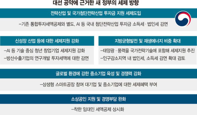 이 대통령이 대선 공약으로 내걸었던 전략산업 국내생산 촉진세제 도입이 유력하다. 기존의 '통합 투자세액공제'와 별도로 국가전략기술급 및 신성장·원천기술급 첨단 제품이 대상이다. 국내에서 최종 생산·판매한 기업들에 생산량, 판매량에 비례해 법인세를 공제하는 방식이다. 이차전지, 반도체 기업 등의 해외이탈을 막는다는 점에서 '한국판 IRA'로도 불린다.