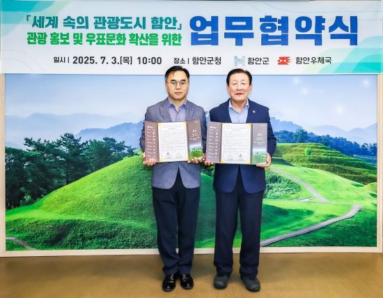 경남 함안군은 함안우체국과 3일 군수실에서 '세계 속의 관광도시 함안' 홍보 및 우정사업 활성화를 위한 업무협약을 체결했다.