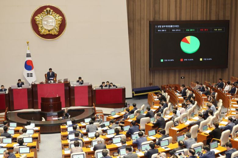 이사의 충실의무를 주주로 확대하는 내용의 상법 개정안이 3일 국회 본회의를 통과했다. 이날 본회의에서 상법 개정 법률안이 재석 272명 중 찬성 220명, 반대 29명, 기권 23명으로 가결되고 있다. /사진=연합뉴스