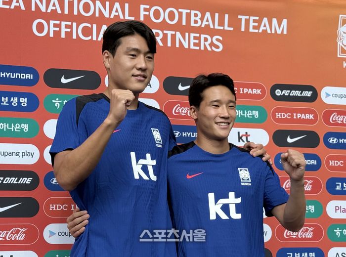 축구대표팀 이호재(왼쪽)와 이태석이 3일 성남종합운동장에서 훈련을 앞두고 사진 촬영에 임하고 있다.성남 | 정다워 기자