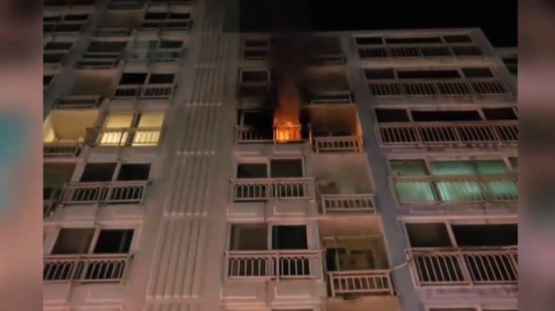 아파트 발코니 쪽에 붉은색 불꽃이 타오릅니다.