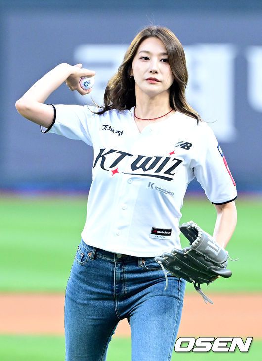 배우 유인영이 시구자로 나서 공을 던지고 있다. 2025.07.02 / dreamer@osen.co.kr