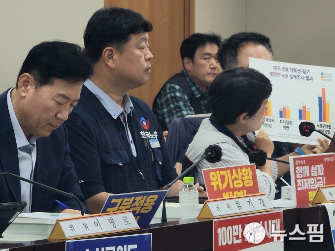 [세종=뉴스핌] 양가희 기자 = 3일 오후 3시 정부세종청사에서 열린 최저임금위원회 제9차 전원회의에서 이미선 민주노총 부위원장(오른쪽)이 대구·경북 대학생·청년 열악한 노동실태조사 결과 그래프를 인쇄한 종이를 들고 발언하고 있다. 류기정 경총 전무(왼쪽), 류기섭 한국노총 사무총장(가운데)는 이 부위원장의 발표를 듣고 있다. 2025.07.03 sheep@newspim.com