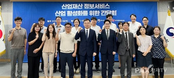 정재환 산업재산정보국장(앞줄 가운데)이 간담회를 마치고 참석자들과 기념촬영을 하고 있다. [사진제공=특허청][대전=팍스경제TV] 특허청은 오늘(3일) 특허청 서울사무소(서울 강남구)에서 지식재산서비스기업, 변리사, 대학 기술이전센터 관계자들과 함께 현장소통 간담회를 열었다고 밝혔습니다.