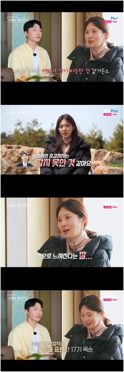 그러나 데이트 내내 17기 옥순은 극도로 말수가 줄어들었다. 17기 옥순은 “제 생각에는 저희가 같은 결인 것 같다. 그래서 대화가 잘 통하는 부분이 있는데, 이성으로 느껴지는 잘 (모르겠다)”라며 직접적으로 자신의 마음을 전했다.