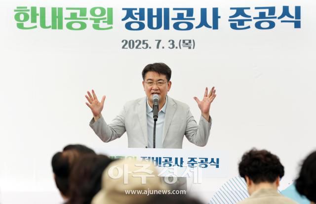 오승록 노원구청장이 3일 오전 서울 노원구한내공원에서 진행된 '한내공원 정비공사 준공식'에 참석해 인사말을 하고 있다.