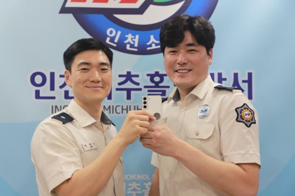 인천 미추홀소방서 소방행정과 소속 오승준(오른쪽) 소방경과 이민기(왼쪽) 소방위가 공동주택 공동현관 출입 시스템인 119패스를 붙인 휴대폰을 함께 들고 있다. 본인 제공 |
