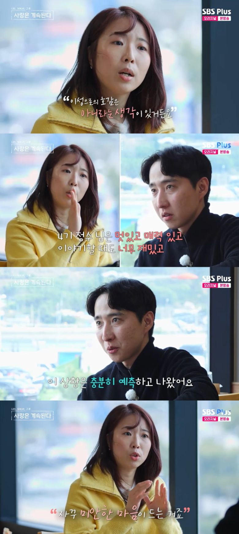3일 방송된 ENA와 SBS Plus의 '나는 SOLO, 그 후 사랑은 계속된다'(이하 '나솔사계')에서는 6기 현숙이 4기 정수에게 솔직한 자신의 마음을 전했다.