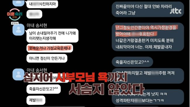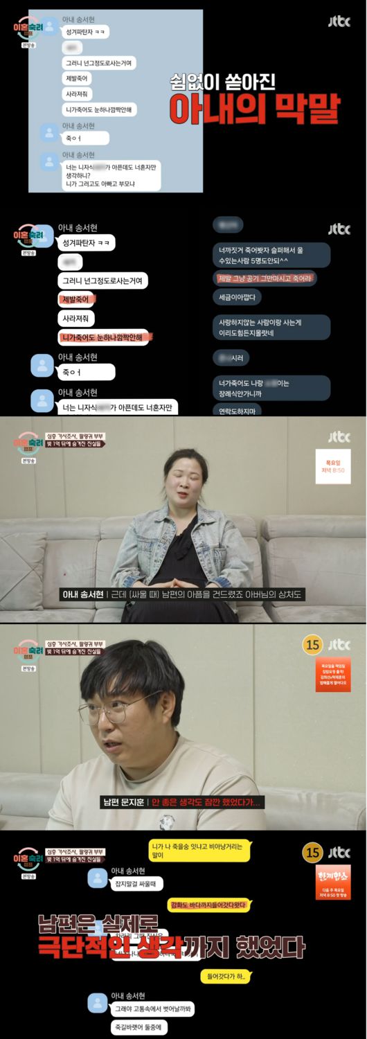 아내는 톡으로 반복적으로 선 넘는 말들을 톡으로 보냈다. 심지어는 시부모님 욕까지 서슴지 않았다. 아내는 “(싸울 때) 남편의 아픔을 건드렸죠. 아버님의 상처도 건드렸다”라고 말했다. 결국 이 사건으로 이혼 직전까지 갔다고 밝혔다. 남편은 이 사건으로 실제로 극단적인 생각까지 했다고 덧붙였다.