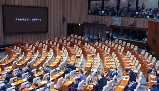3일 오후 국회에서 열린 본회의에서 국민의힘 의원들이 불참한 가운데 김민석 국무총리 임명동의안 무기명 투표가 진행되고 있다. [뉴스1]
