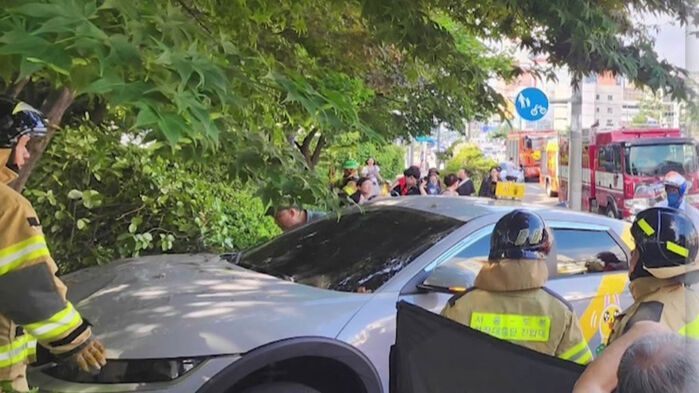 택시 1대가 인도에 올라타 멈춰서 있고, 구조대원들이 현장을 오가며 분주하게 구조 작업을 벌이고 있습니다.