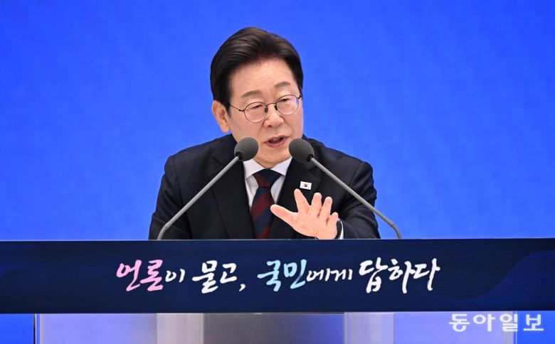 이재명 대통령이 3일 서울 종로구 청와대 영빈관에서 열린 취임 첫 공식 기자회견 ‘대통령의 30일, 언론이 묻고 국민에게 답하다’에 참석해 기자들의 질문에 답하고 있다. 2025.07.03. 송은석 기자 silverstone@donga.com |