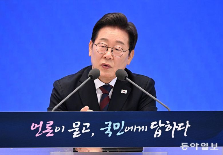 이재명 대통령이 3일 서울 종로구 청와대 영빈관에서 열린 취임 첫 공식 기자회견 ‘대통령의 30일, 언론이 묻고 국민에게 답하다’에 참석해 기자들의 질문에 답하고 있다. 2025.07.03. 송은석 기자 silverstone@donga.com |