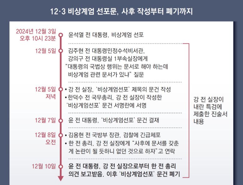 특검팀은 최근 강 전 실장으로부터 지난해 12월 4일 비상계엄 해제 후 하루 뒤인 5일 ‘비상계엄 선포문’이란 제목의 문건을 직접 만들었다는 진술을 확보한 것으로 알려졌다. 강 전 실장은 “(계엄 선포 당시) 비상계엄 담당 부처인 국방부에서 비상계엄 관련 문서를 만드는 등 행정 조치를 하지 않았다”며 “제가 문건을 만들어 한 전 총리와 김 전 장관 공관을 방문해 서명을 받았다”고 진술했다고 한다.