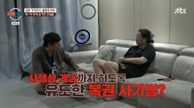 이에 아내는 "(복권 사기당한) 그 돈이 사행성 게임 사이트로 넣어진 것"이라며 "복권 번호는 1주일에 한 번씩 준다고 했다"고 해명했다. 처음 복권 사기당한 돈이 사행성 도박 사이트의 시드 머니로 들어갔다는 설명이었다.