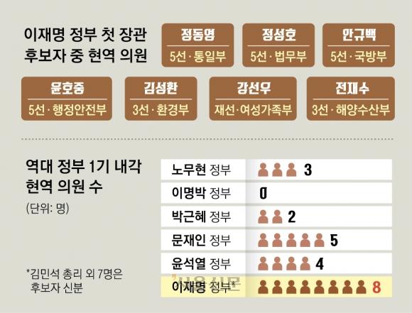 3일 정부에 따르면 이재명 정부 1기 내각(후보자)에 현직 의원은 8명이다. 이날 국회에서 임명동의안이 가결된 김민석(4선) 국무총리와 정동영(5선) 통일부·정성호(5선) 법무부·안규백(5선) 국방부·윤호중(5선) 행정안전부·김성환(3선) 환경부·강선우(재선) 여성가족부·전재수(3선) 해양수산부 장관 후보자 등이다. 지금까지 발표된 총리 및 장관 후보자(18명)의 44.4%가 국회의원을 겸직한다.
