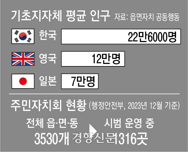 민주화 이후 1988년 지방자치법 개정, 1991년 민선 지방의회 부활, 1995년 단체장 직선제로 지방자치 제도가 부활했지만, 읍면자치는 되살아나지 못했다. 대신 시군구 자치로 대체됐다. 국내 시군구 평균 인구는 20만명이 넘는다. 평균 인구 기준으로 지방자치를 하는 국가 중 가장 ‘덩치’가 큰 편이다.