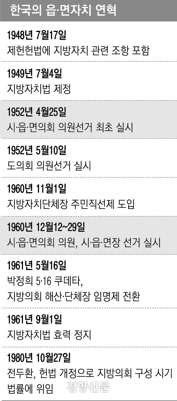 지금은 생소하지만 우리는 이미 읍면자치를 경험한 적이 있다. 1948년 제헌헌법에 지방자치가 명시됐고, 1949년 지방자치법이 제정된 후 1952년 시읍면 의회가 구성됐다. 시읍면 의회는 1960년까지 3기나 구성됐고, 같은 해 시읍면장 직선제도 시행됐다. 당시 선출된 면장은 대부분 독립운동이나 사회운동을 했던 이들로, 마을에서 정신적 지도자로 존경받았다.