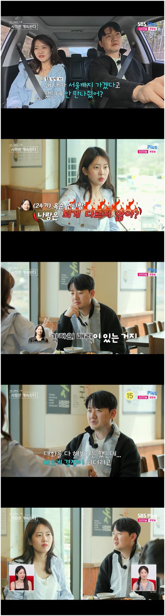 21기 옥순은 자신의 이상형인 23기 영호에게 어쨌든 다가가고 싶었다. 그러나 23기 영호는 지난 연애를 통해 장거리는 거부하는 상태였다. 21기 옥순의 거주지는 대구, 23기 영호의 거주지는 서울이었다. 21기 옥순은 “더 이상 아니다. 내 마음은 그쪽이 아니다. 그건 마음이다. 어쩔 수 없다”라며 말하더니 눈물을 쏟았다. 그러나 23기 영호는 21기 옥순을 달래주면서, 끝내 거절을 표했다./osen_jin0310@osen.co.kr