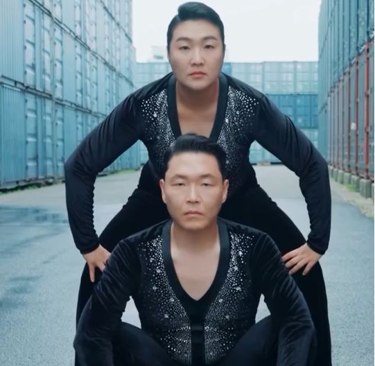 영상 속 두 사람은 블랙 벨벳에 큐빅이 촘촘히 박힌 ‘싸이 시그니처 무대 의상’을 똑같이 맞춰 입고, 선후 위치를 계속 바꿔가며 포즈와 표정 싱크를 맞췄다.