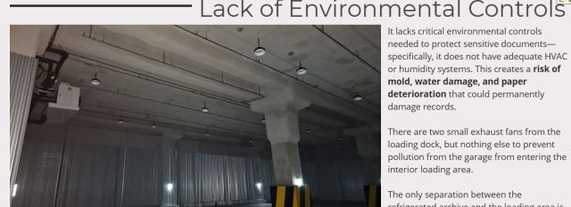하지만 현재 이관 절차가 충분한 보호 조치 없이 진행되고 있다는 점에 대해 깊은 우려를 표합니다. 확인된 바에 따르면, 현재 이관 예정지는 임시로 지정된 장소로 고양시 외곽에 위치한 냉동-냉장 물류창고 건물의 4층입니다. 대중교통 접근성이 부족하며 온도-습도 조절, 화재 대비 시스템, 보안 디지털 인프라가 모두 공공기록물 보존 기준치에 미비한 것으로 알려져 있습니다. 보전과 복원 그리고 전산화를 위한 시설이 추가로 들어설 자리가 부족한 조건이기도 합니다. 나아가 장기적인 계획을 위한 로드맵도 현재 공개되고 있지 않고 있어 이 미비한 임시시설이 자연스레 장기시설로 고착하지 않을까 우려됩니다.