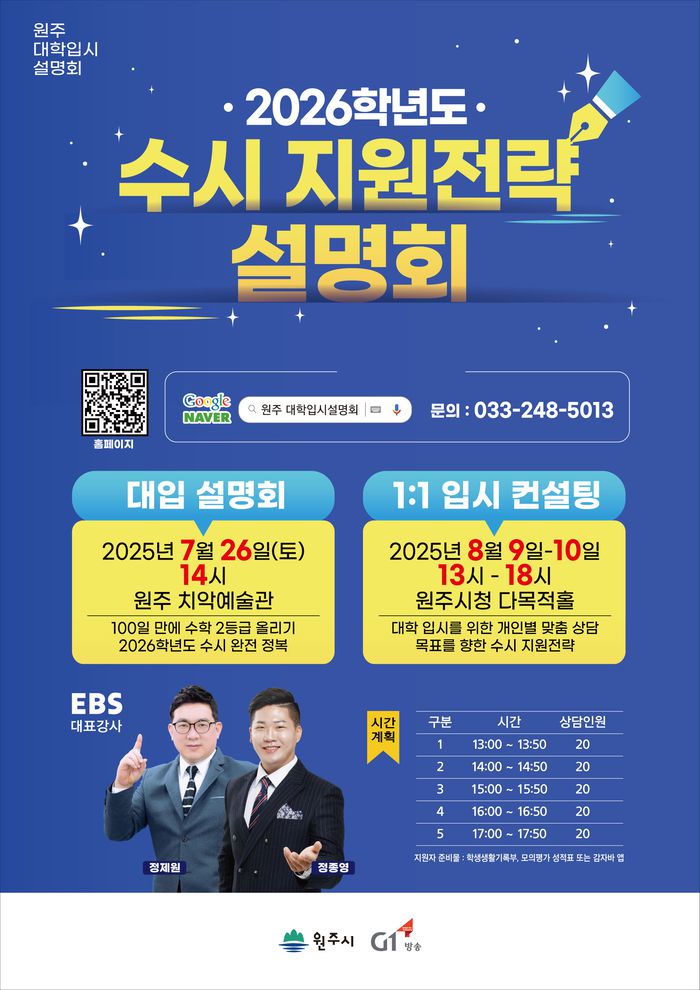 오는 26일(토) 치악예술관에서 열리는 ‘2026학년도 수시 지원전략 설명회’에서는 EBS 대표 강사진(수학 정종영, 입시 정제원)으로 구성된 최고의 입시 전문가들이 수험생들이 가장 어려워하는 수학 교과목 학습법과 함께 최신 입시 정책 및 제도 변화에 따른 대응 전략을 안내할 예정이다.