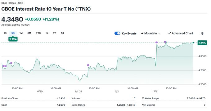 미 국채 10년물 금리 차트, 자료=야후 파이낸스, 2025.07.04 koinwon@newspim.com |