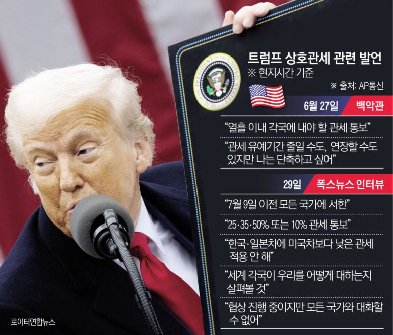 이날 정치매체 폴리티코 등에 따르면 아이오와주 방문에 앞서 기자들과 만난 트럼프 대통령은 "서한을 하루에 10개국씩 여러 나라에 보낼 것"이라며 "당신이 20%나 25% 또는 30%의 관세를 내게 될 것" 등의 내용을 담을 것이라고 말했다.