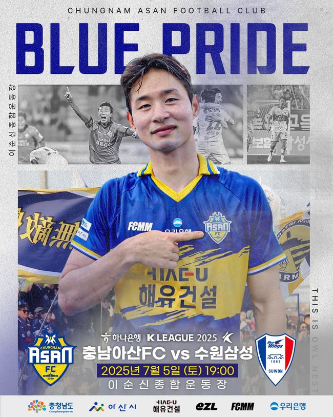충남아산프로축구단(구단주 오세현, 대표이사 이준일, 이하 충남아산FC)은 5일(토) 오후 7시 이순신종합운동장에서 열리는 하나은행 K리그2 2025 19라운드 홈경기에서 수원삼성블루윙즈와 격돌한다. 충남아산FC는 현재 6승 7무 5패(승점 25점)로 리그 7위에 올라 있다.