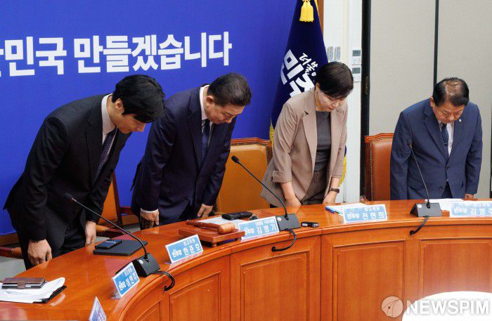 [서울=뉴스핌] 윤창빈 기자 = 김병기 더불어민주당 대표 직무대행 겸 원내대표 등 최고위원들이 4일 오전 서울 여의도 국회에서 열린 최고위원회의에서 인사를 하고 있다. 2025.07.04 pangbin@newspim.com
