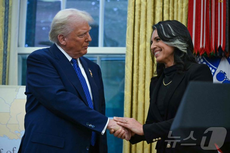 도널드 트럼프 미국 대통령이 지난 2월 11일(현지시간) 워싱턴 백악관에서 열린 털시 개버드 국가정보국(DNI) 국장의 취임식서 악수를 하고 있다. 2025.02.13 ⓒ AFP=뉴스1 ⓒ News1 |
