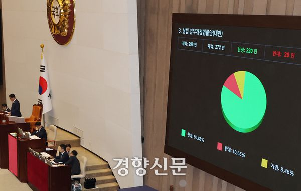 3일 국회 본회의에서 상법 일부개정법률안이 통과되고 있다. 박민규 선임기자